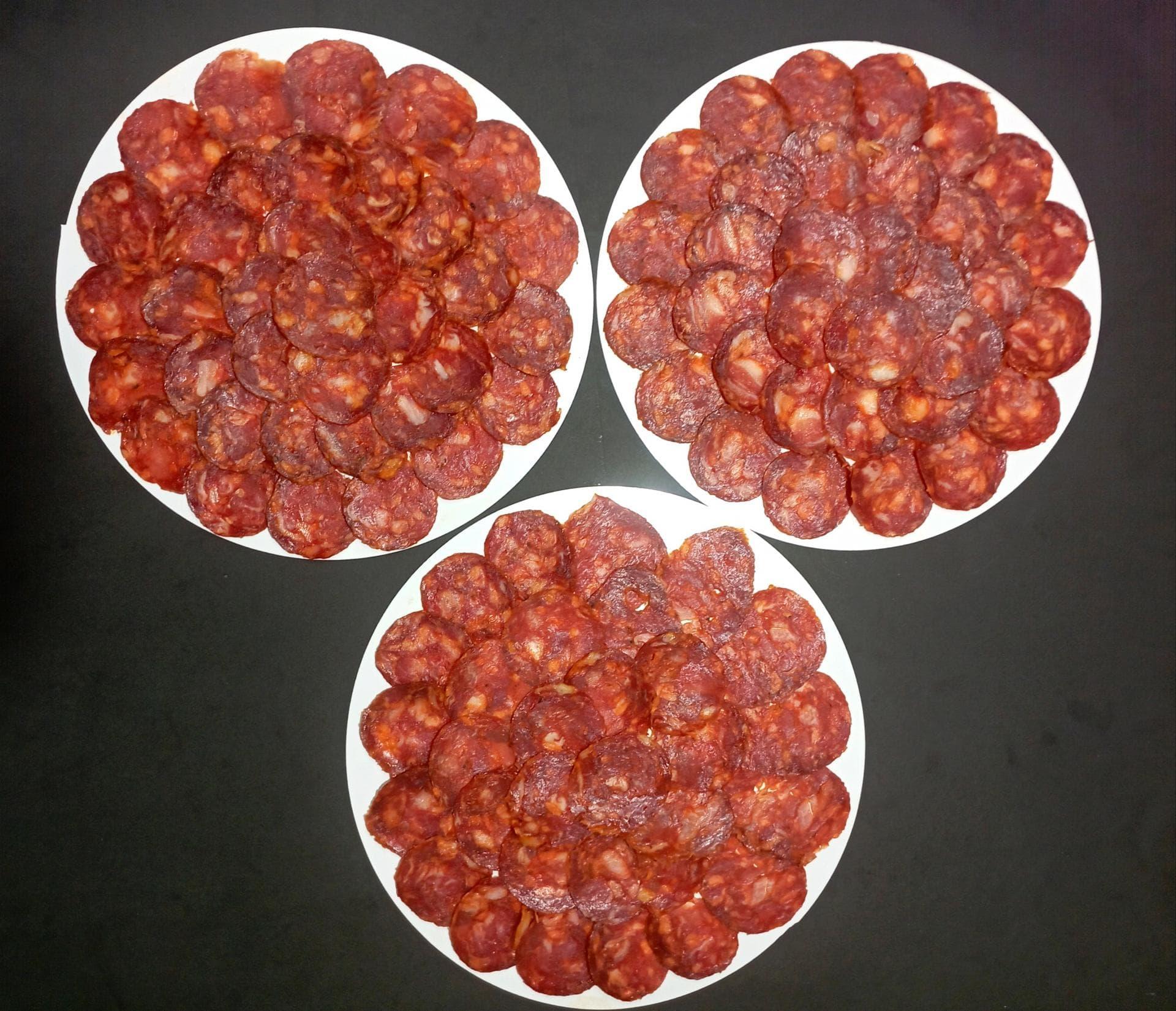 Diez bandejas individuales con lonchas finas de chorizo ibérico, cortadas a mano y envasadas al vacío.